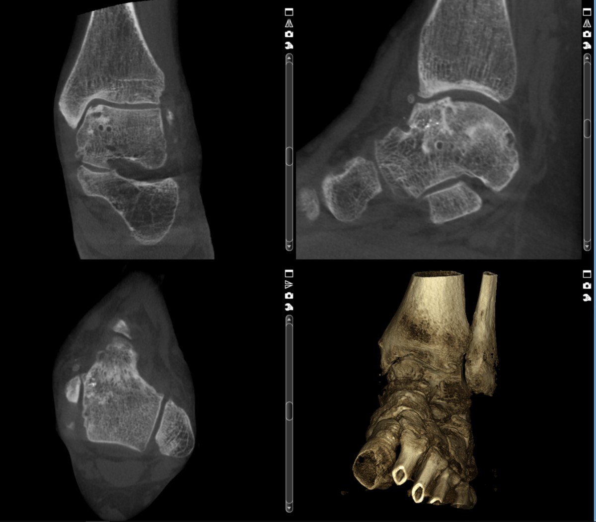 40 Jahre alte Patientin mit zunehmenden Schmerzen am oberen Sprunggelenk. Sprunggelenkbruch vor 20 Jahren. Die DVT zeigt kleinste Zysten im Sprungbein. Knöcherne Ausziehungen (Osteophyten) am vorderen Gelenkspalt können exakt lokalisiert werden.