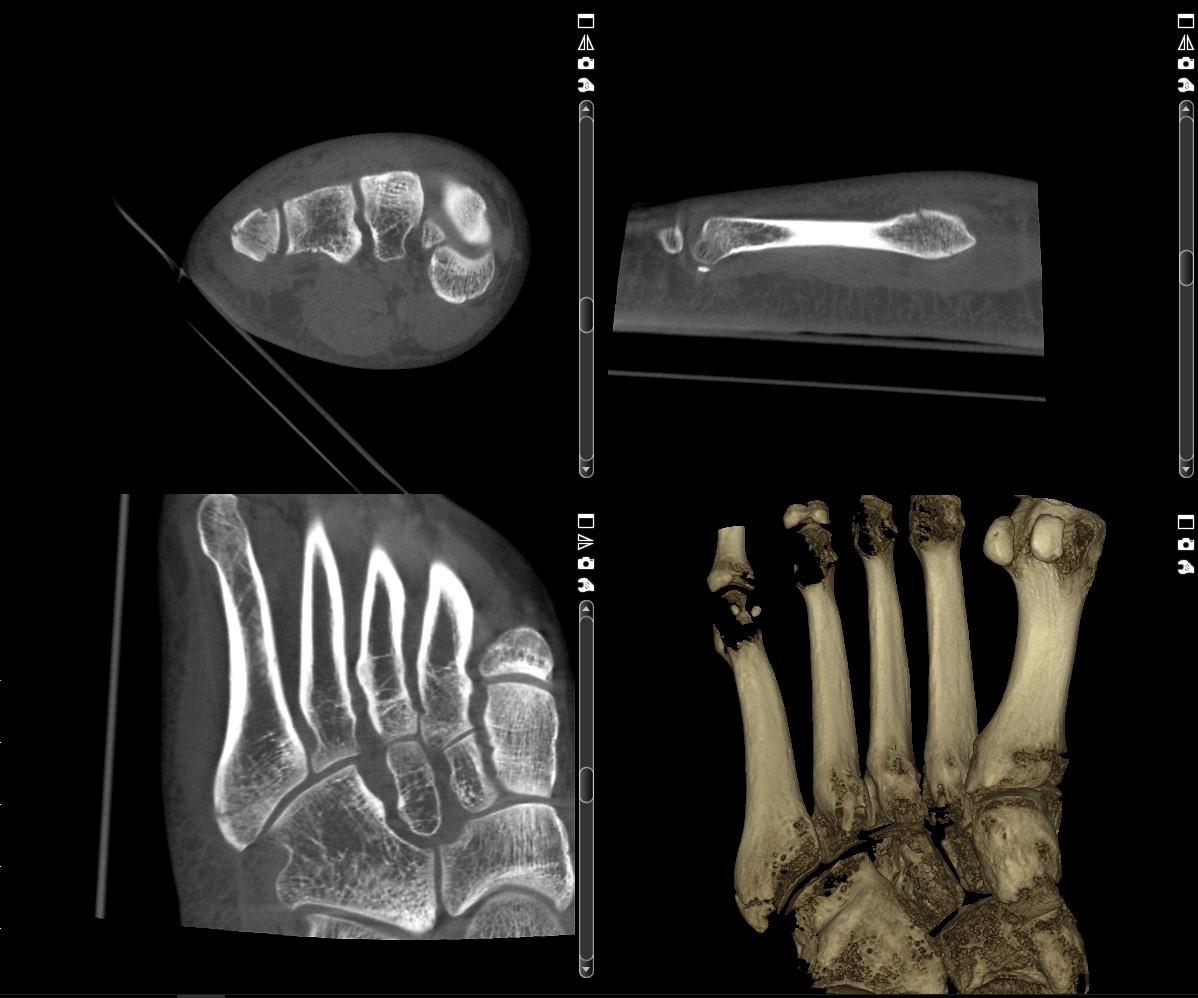 23 Jahre alter Patient mit einem basisnahen Bruch am fünften Mittelfußknochen. Die 3-D Darstellung zeigt eine durchgängige Frakturlinie. In der konventionellen Röntgenaufnahme konnte der Bruch nicht ausreichend dargestellt werden.