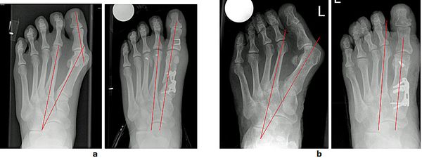 b Korrektur einer schweren Hallux valgus Fehlstellung mit luxierten Krallenzehen und chronischer Metatarsalgie durch eine Lapidus Arthrodese. Mit dieser Technik können selbst hochgradige Fehlstellungen begradigt werden. Bei beiden Techniken wird der Knochen wird mit einer winkelstabilen Platte fixiert. Dies bietet ein höchstes Maß an Stabilität und ermöglicht die sofortige postoperative Belastung.