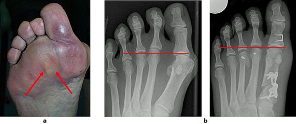Abb.9: a Fixierte Krallenzehenfehlstellung mit Clavus (Hühnerauge). b Der störende Knochen wird entfernt (Resektionsarthroplastik nach Hohmann) Eine weitere Begleiterkrankung des Spreizfußes ist die Metatarsalgie. Es handelt sich um ein weit verbreitetes Beschwerdebild bei dem es zu belastungsabhängigen Schmerzen unter den Mittelfußköpfchen kommt. In fortgeschrittenen Stadien der Erkrankung ist eine Schwielenbildung sichtbar. Die Beschwerden können in den Anfangsstadien mit einer Einlage nach Maß und einer Schmetterlingsrolle am Schuh gut behandelt werden. Bestehen bei ausgeschöpfter konservativer Therapie noch Beschwerden erfolgt eine operative Verlagerung der Mittelfußköpfchen um den Druck unter dem Vorfuß zu reduzieren.